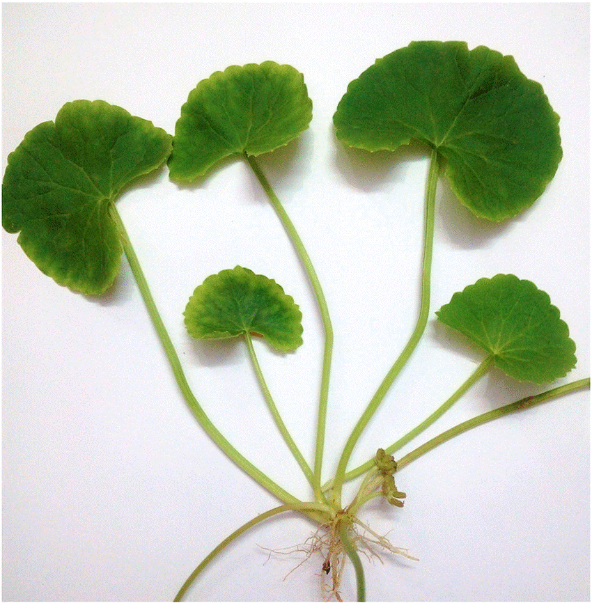 - Daun berbentuk bulat atau menyerupai ginjal dengan tepi halus dan urat menyebar seperti kipas.