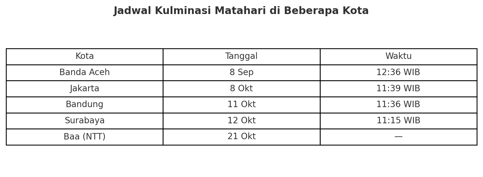BMKG merilis jadwal kulminasi utama di sejumlah kota, antara lain: