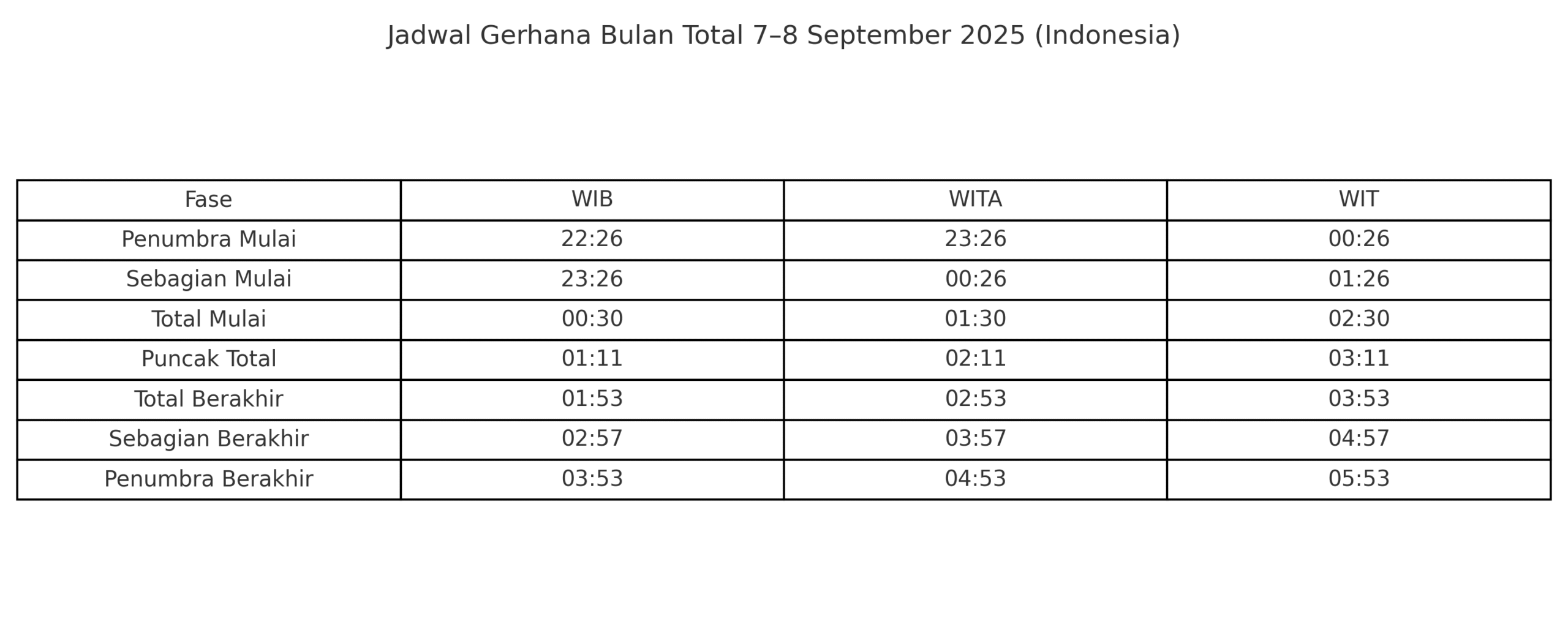 BMKG merinci, berikut perkiraan waktu terjadinya gerhana bulan total 7–8 September 2025 dalam waktu Indonesia barat (WIB):