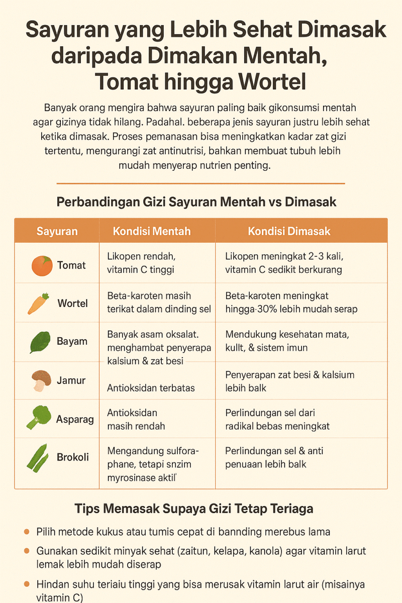 Tidak semua sayuran terbaik dimakan mentah. Tomat, wortel, bayam, jamur, asparagus, hingga brokoli lebih kaya manfaat jika dimasak dengan cara yang tepat. Kuncinya adalah memilih metode memasak yang tidak terlalu lama dan menggunakan sedikit minyak sehat, sehingga nutrisi tetap maksimal.