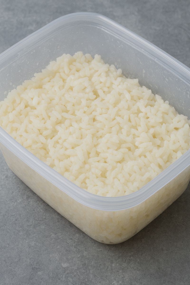 Simpan nasi dalam wadah tertutup rapat pada suhu 4°C atau lebih rendah. Hindari membuka wadah berulang kali agar suhu tetap stabil.